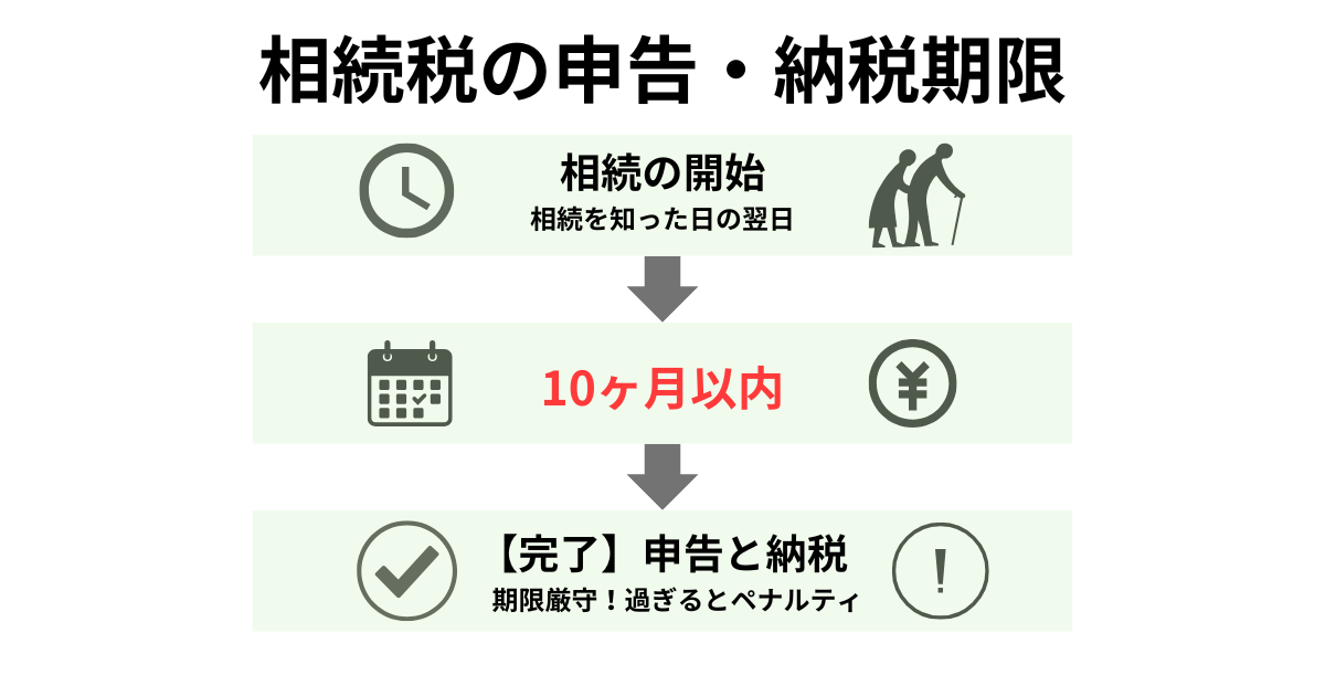 なお、相続税の申告・納税期限は「相続の開始があったことを知った日(通常の場合は、被相続人の死亡の日)の翌日から10ヶ月以内」と定められています。期限を過ぎると加算税や延滞税が発生することがあるため、早めに動くことが重要です。