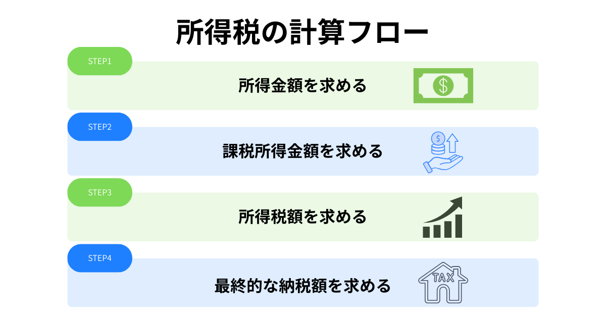 所得税の計算は、次の4ステップで進みます。仕組みを順番に理解するだけで、控除の使い方が大きく変わります。