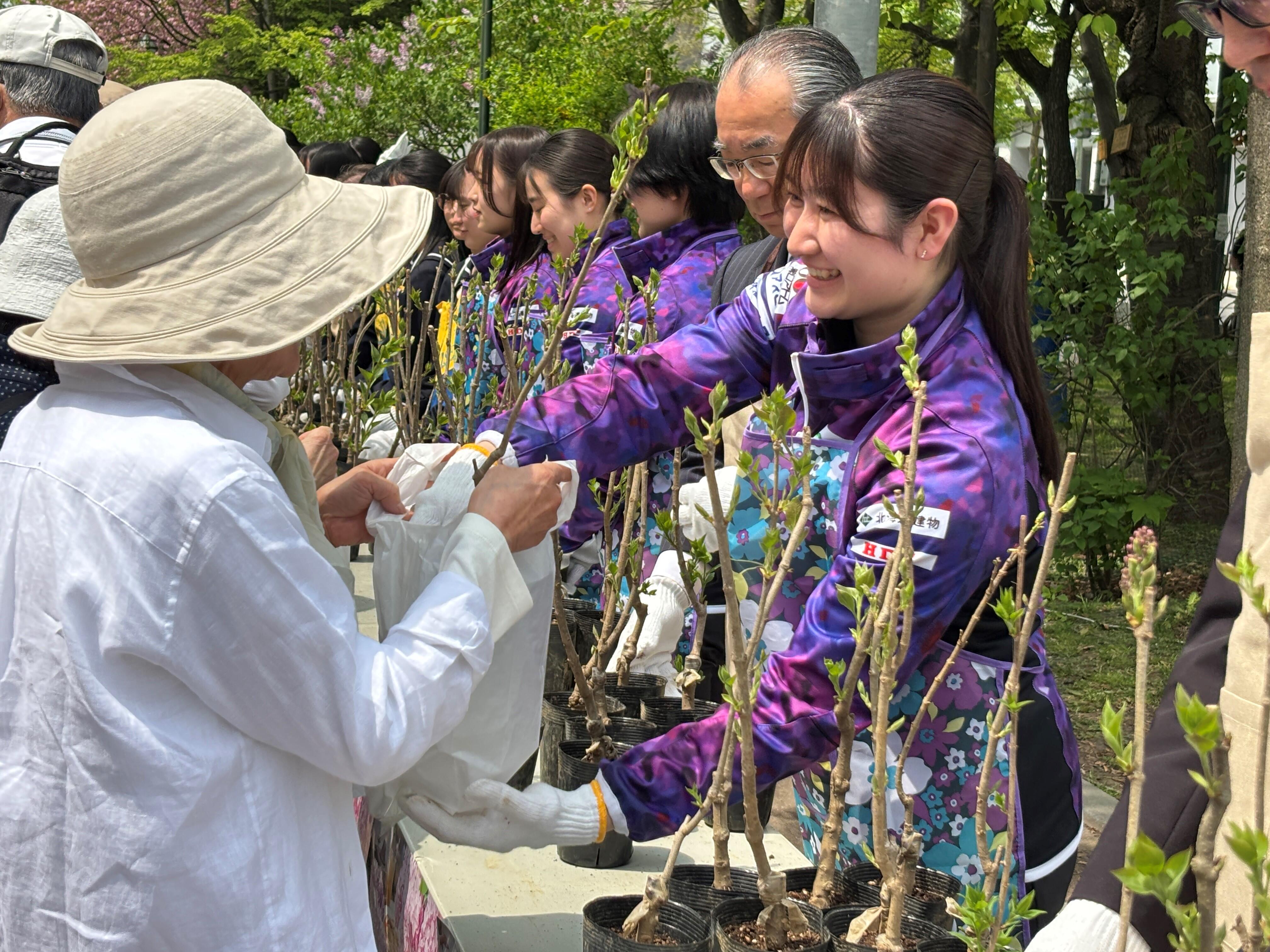 「札幌をライラックの花に包まれた美しい街に」との願いを込めて、1959年より毎年「さっぽろライラックまつり」に協賛しております。1975年からは、ライラックの苗木をプレゼントしており、皆さまのご家庭の庭木として親しまれております。