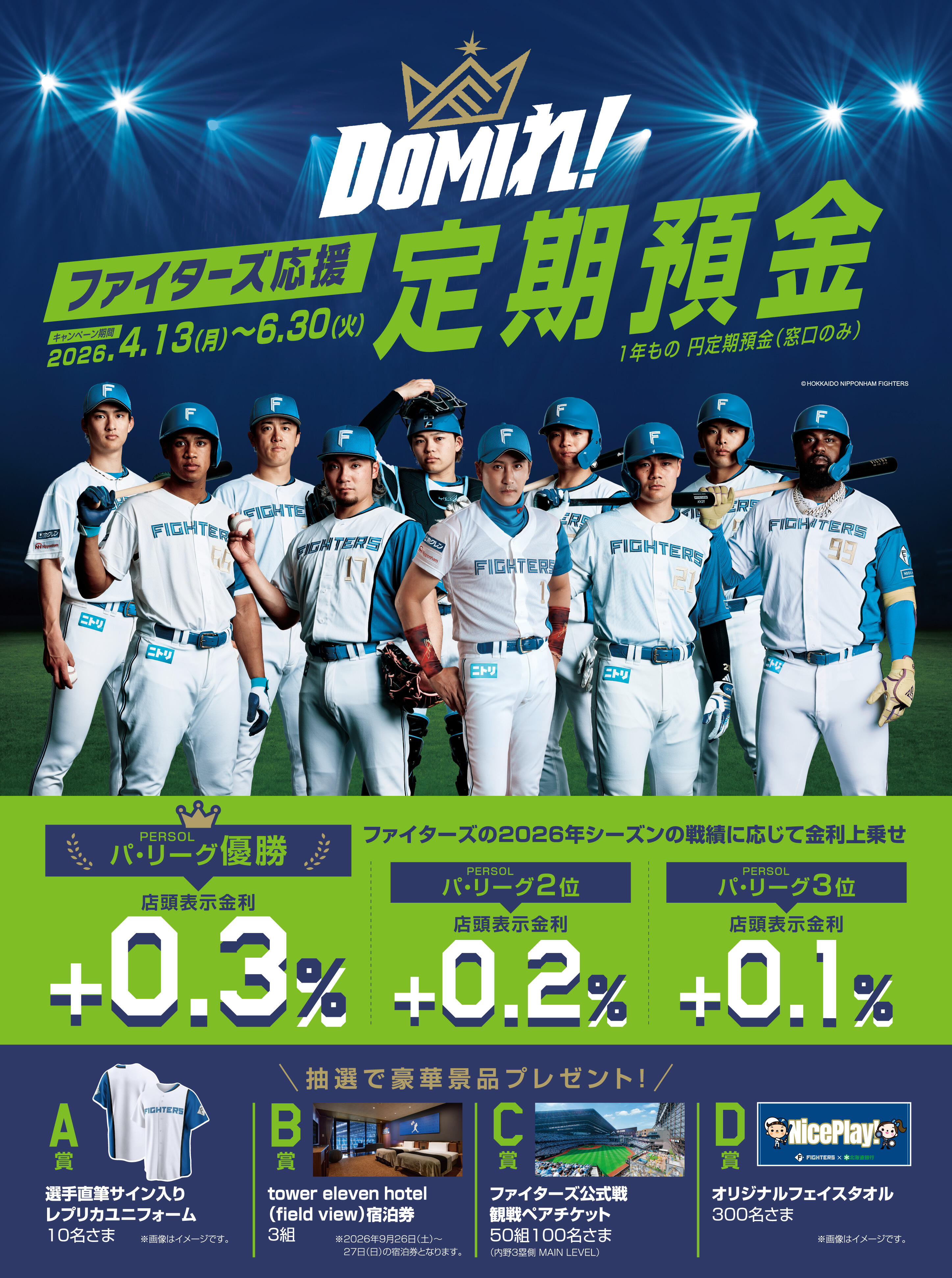 北海道日本ハムファイターズの2026年度パーソル パ・リーグ公式戦の戦績により、お預け入れ時の店頭表示金利に以下の金利を上乗せいたします。